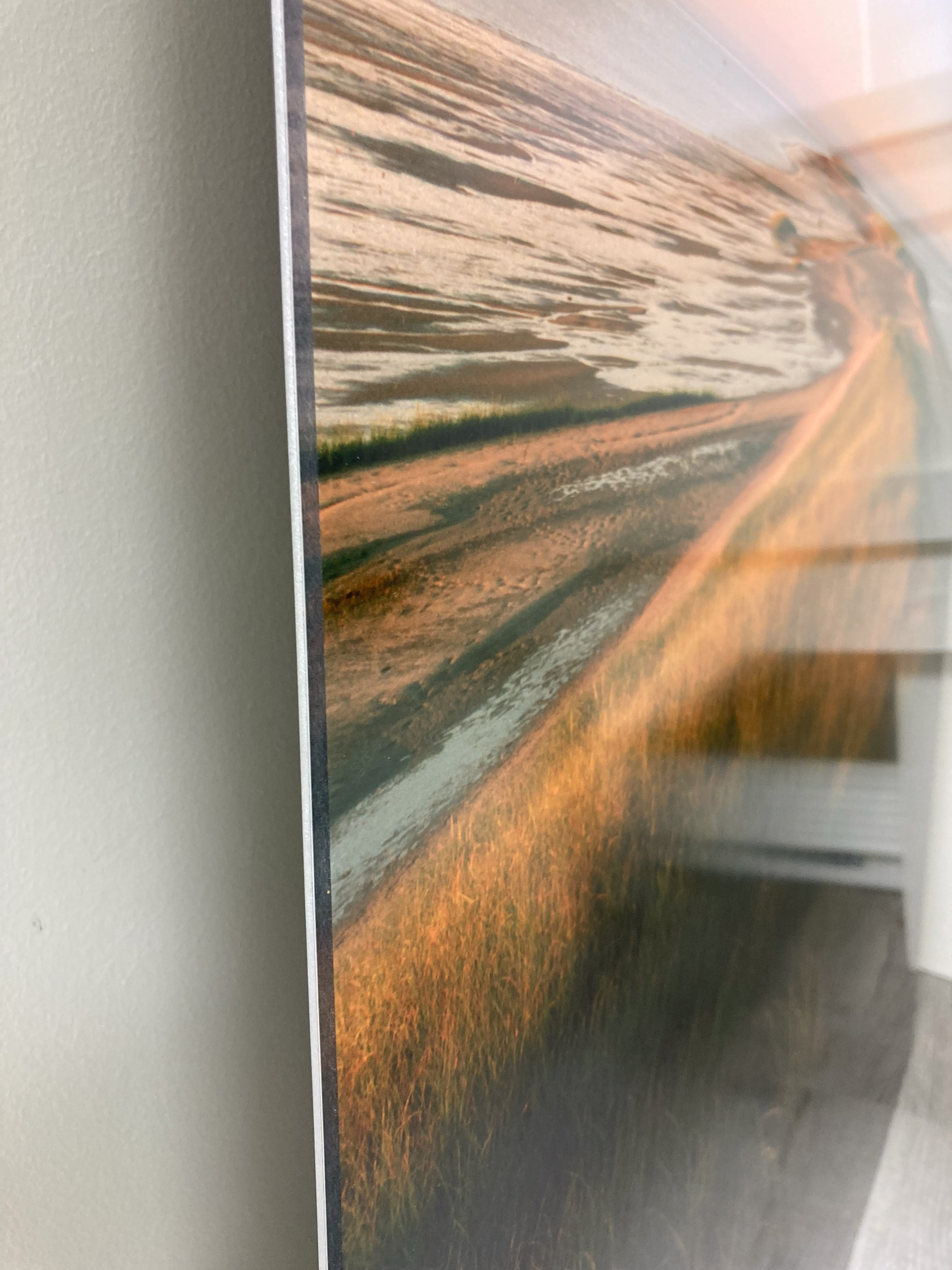 My work is ideally suited for face-mounting, and this is my preferred presentation. The face of the print is mounted directly to an acrylic glazing with a special adhesive, and then back-mounted to a substrate (aluminum is common) with hanging hardware attached. The resulting piece is extraordinary with a virtually glare-free, frameless, contemporary look.